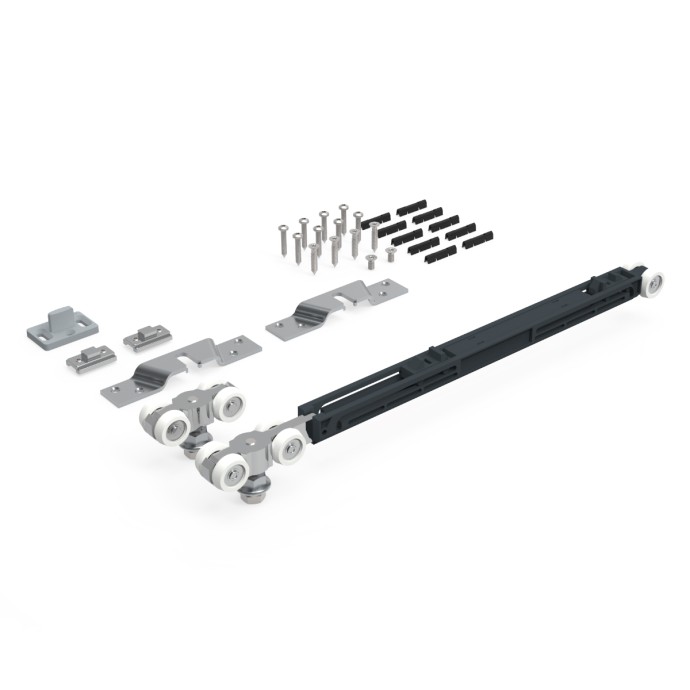 Set completo de accesrios con capacidad de carga de 90kg., con cierre suave para puertas correderas de madera, que incluye dos carros de cojinetes, pletinas fijación a puerta, juego de topes, guiador de suelo en plástico técnico en acabado gris, 2 softclose doble para cierre y apertura amortiguados y tornillería para su instalación.