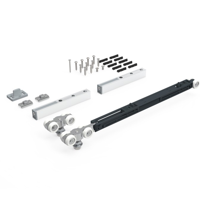 Set completo con capacidad de carga de 90kg., para puertas correderas de madera enrasadas a la guía, que incluye dos carros de cojinetes, y dos conjuntos para embutir mecanismo, juego de topes, guiador de suelo en plástico técnico en acabado gris, dos softclose doble para cierre y apertura suave amortiguado y tornillería para su instalación.
